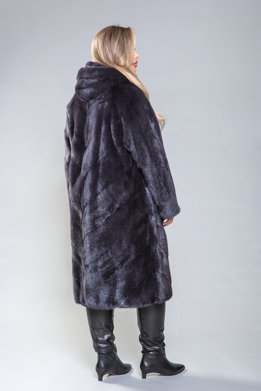 Полупальто из меха норки с капюшоном. Эта модель объединяет несколько техник кроя: передняя часть выполнена в технике роспуска, низ оформлен диагональной выкладкой пластин, а спинка состоит из полностью диагональной выкладки. Для удобства предусмотрены регулируемые утяжки на талии, рукавах и подоле. Длина изделия составляет 110 см. Удобный крой обеспечивает максимальный комфорт, а благородный оттенок муссона придаёт образу безупречную гармонию. Пальто изготовлено из высококачественного меха и выглядит изысканно!