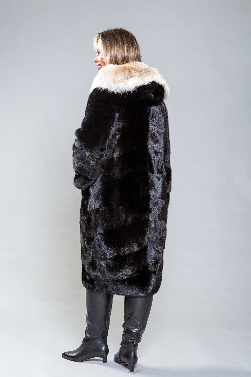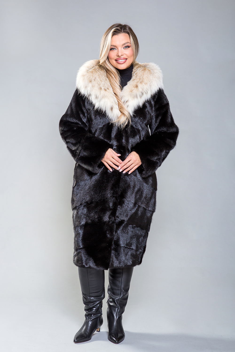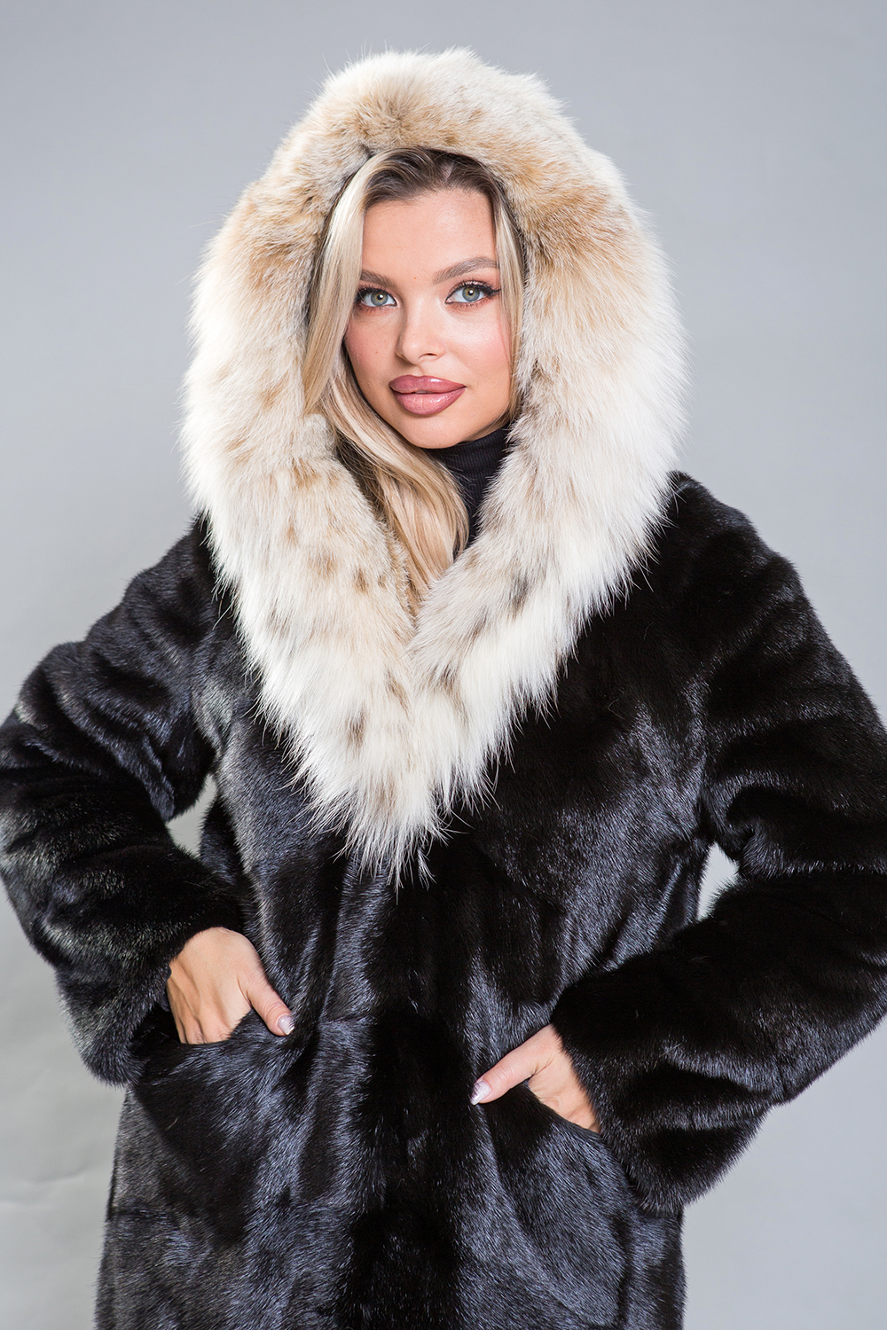Полупальто из норки с капюшоном из рыси выполнено в технике диагональной выкладки пластин, что придает ему изысканность. Для удобства предусмотрены регулируемые утяжки на талии, рукавах и по низу изделия. Длина изделия 110 см, рукава модели можно укоротить при помощи скрытых молний. Карманы фиксируются на магнитах.
