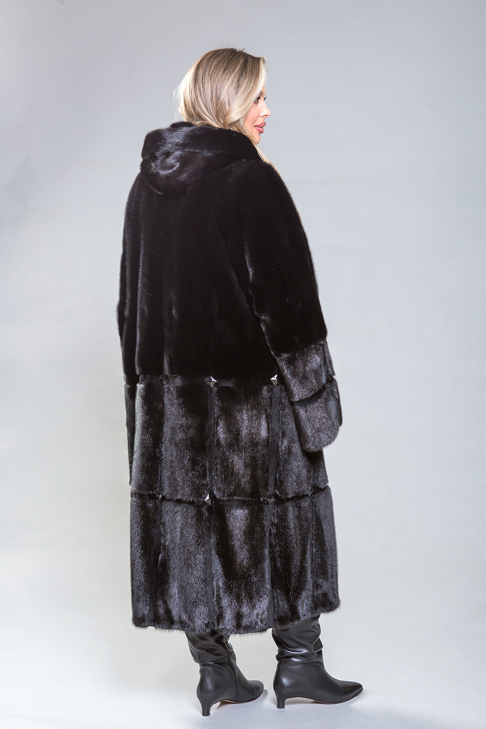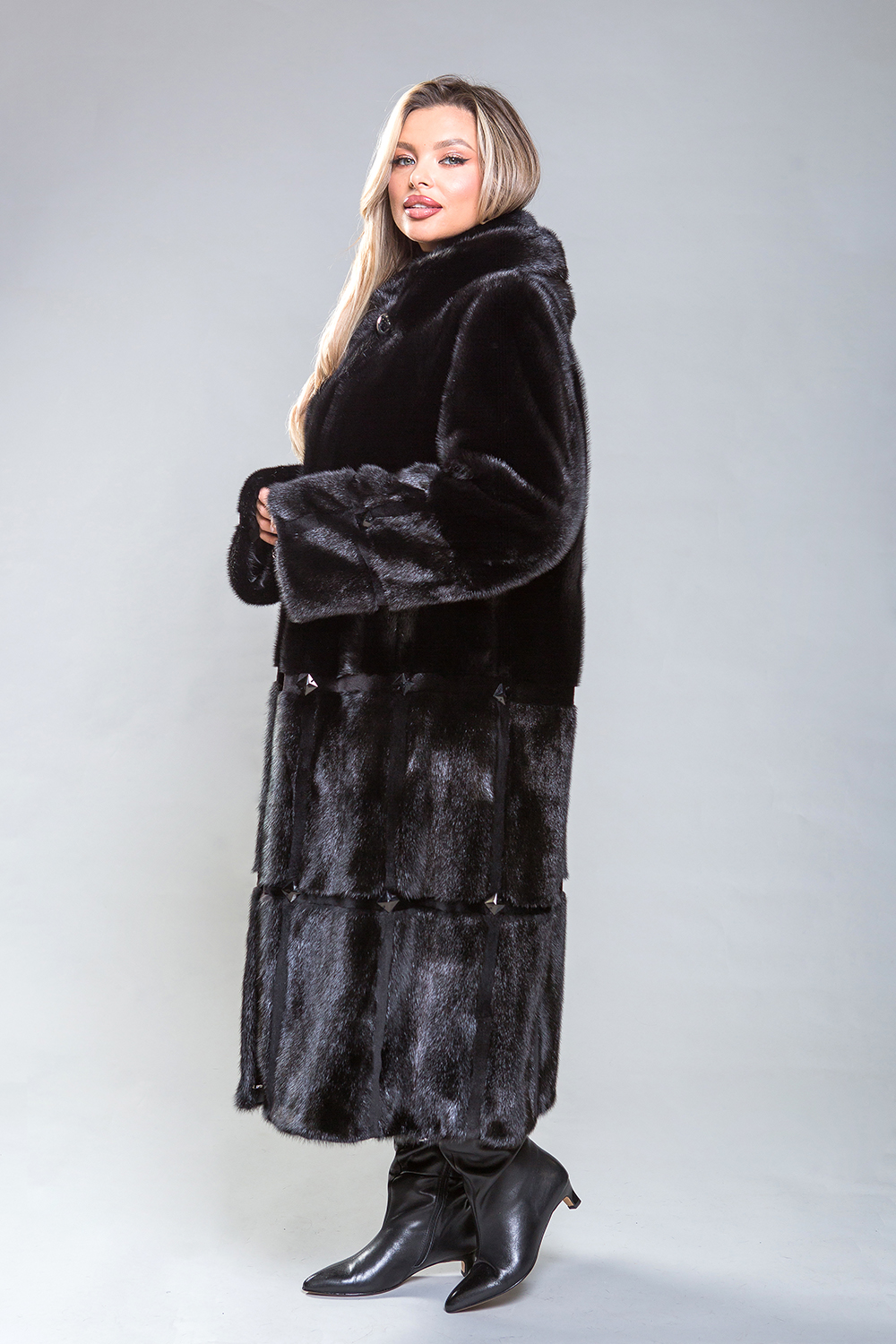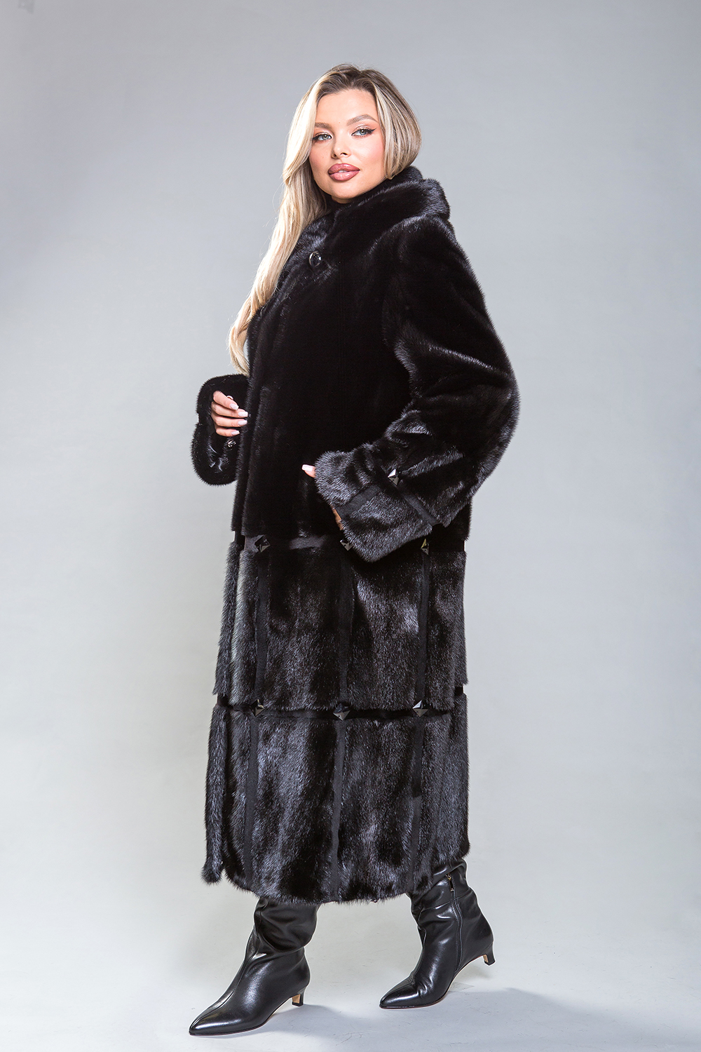 Полупальто из норкового меха с капюшоном, выполненное в виде пластин. Шубка имеет регулирующие утяжки на рукавах, на талии и по низу модели, что позволяет легко подогнать изделие по фигуре. Длина полупальто составляет 120 см. Шубка декорирована стриженной норкой и стеклярусами, что придаёт ей нарядный и праздничный вид, стеклярусы при желании возможно убрать. Универсальный классический фасон делает эту шубку настоящей находкой для женщин любого типа фигуры. Длинное норковое пальто — это отличный вариант для холодной сибирской зимы!