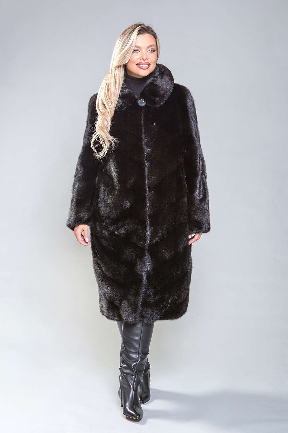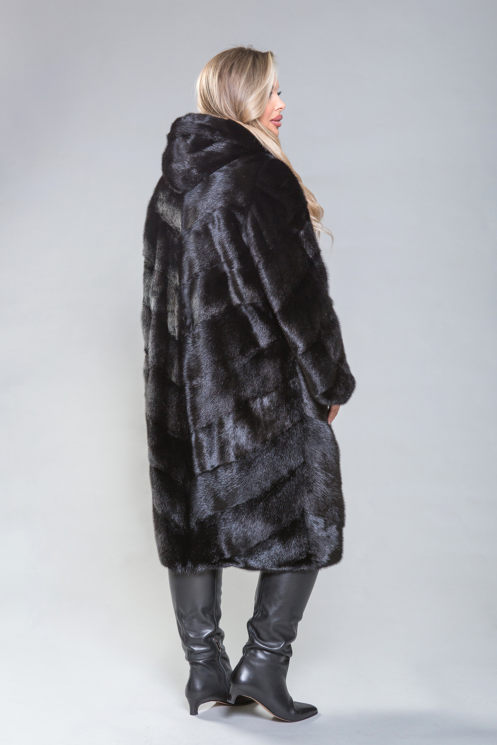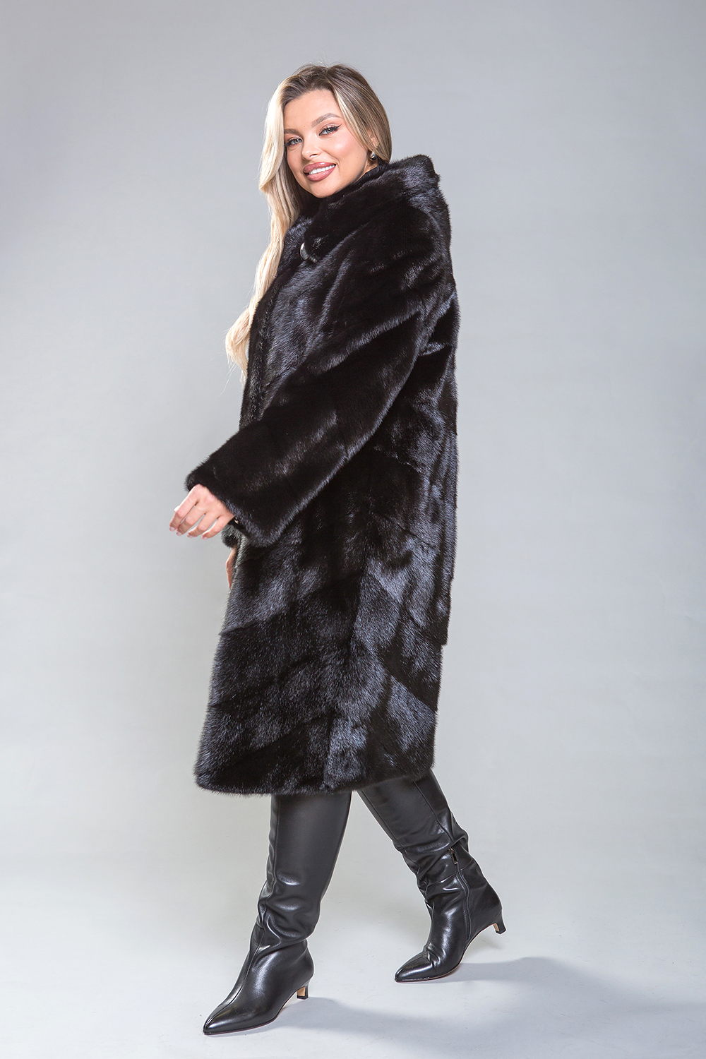 Полупальто из норки с капюшоном, выполненное в стиле диагональных пластин. Модель оснащена регулируемыми утяжками на талии, рукавах и по низу, что позволяет добиться идеального силуэта. Длина изделия составляет 110 см. Это норковое пальто обладает удобным кроем, обеспечивающим максимальный комфорт при носке. Благородный черный цвет добавляет образу изысканности и гармонии.