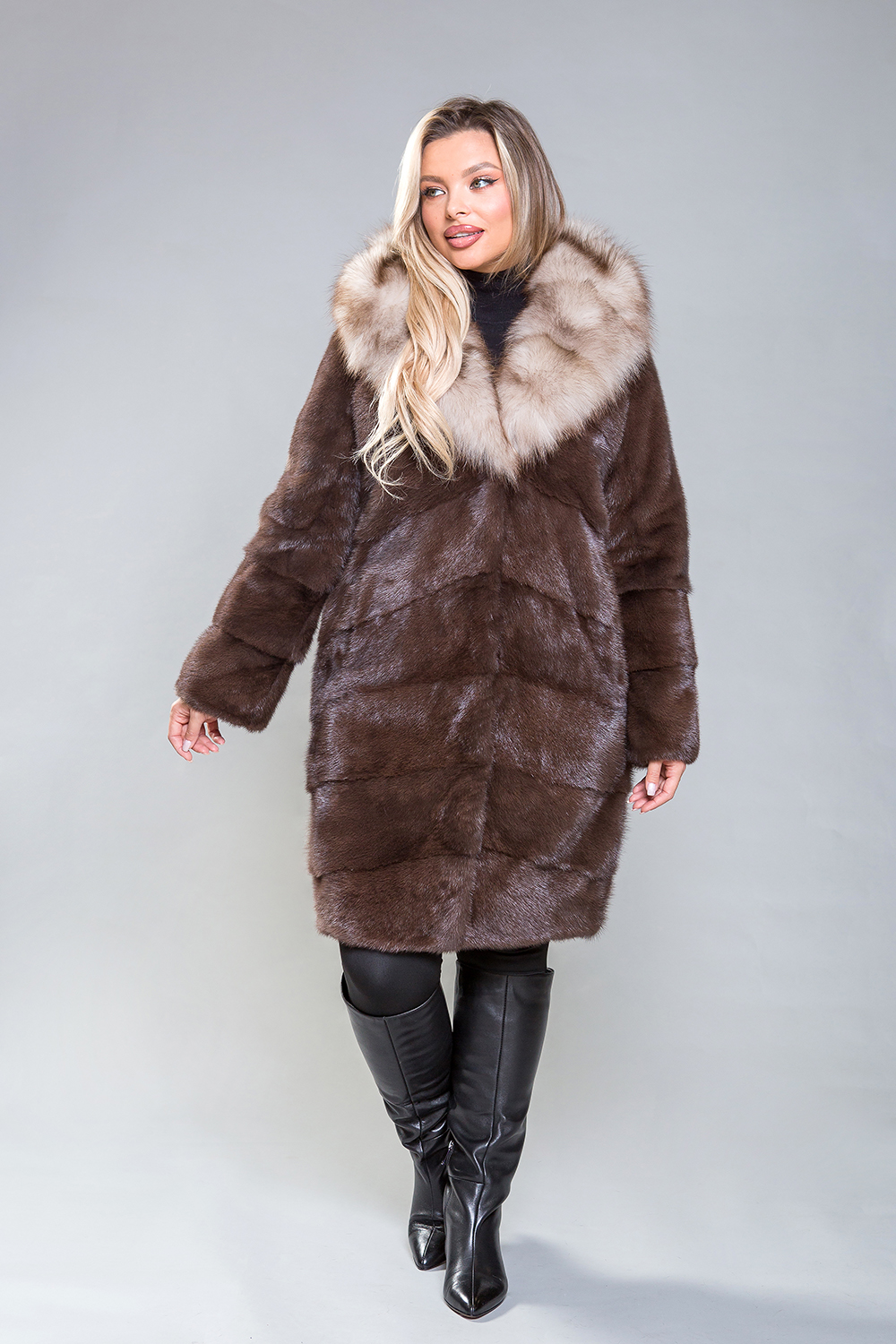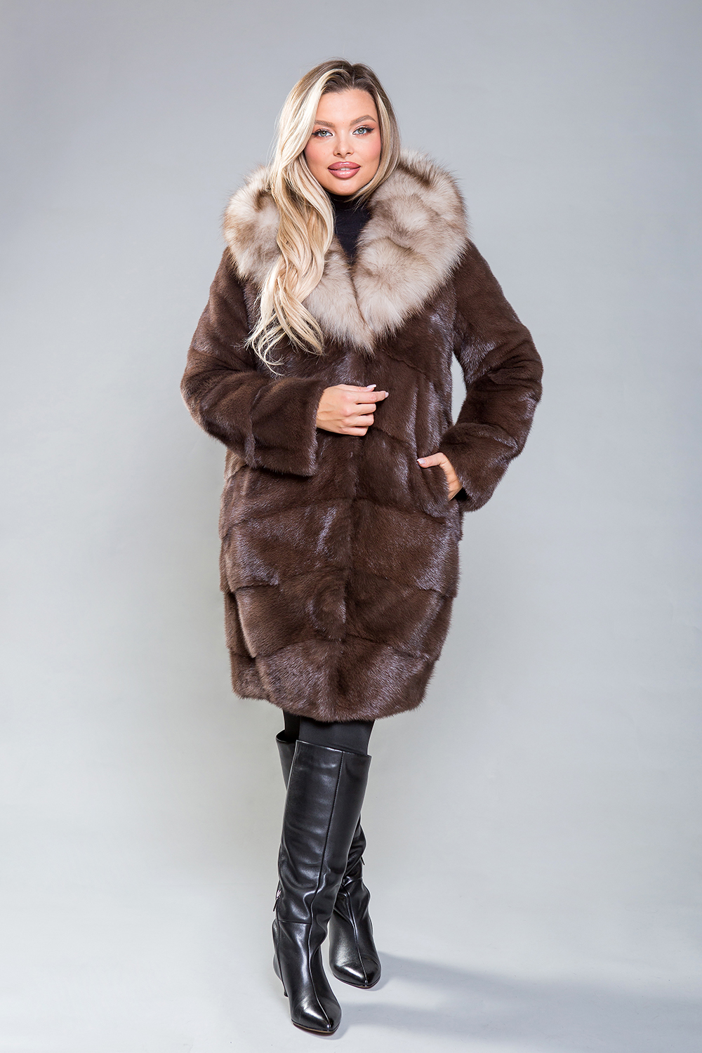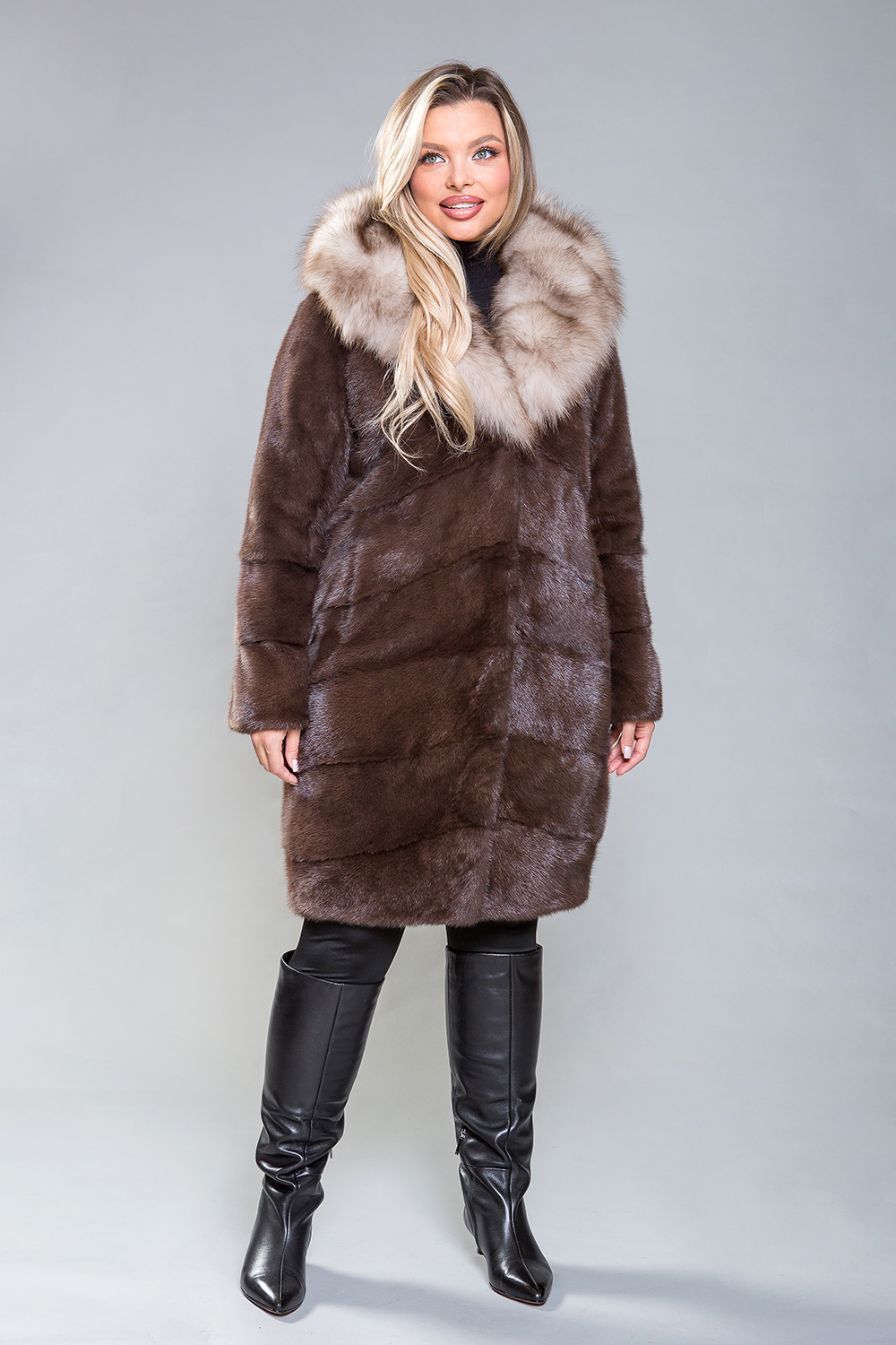 Полупальто из норкового меха с отделкой из куницы. Крой выполнен по технологии диагональной выкладки пластин. Внутренние утяжки на талии, рукавах и подоле позволяют регулировать посадку. Длина полупальто — 100 см. Рукава можно укоротить с помощью скрытых молний. К низу изделие слегка заужено. Эта модель гарантирует максимальный комфорт благодаря продуманному лекалу. Капюшон из роскошного меха куницы придает образу утонченность и благородство. Полупальто подчеркнёт статус и добавит солидности любой женщине.