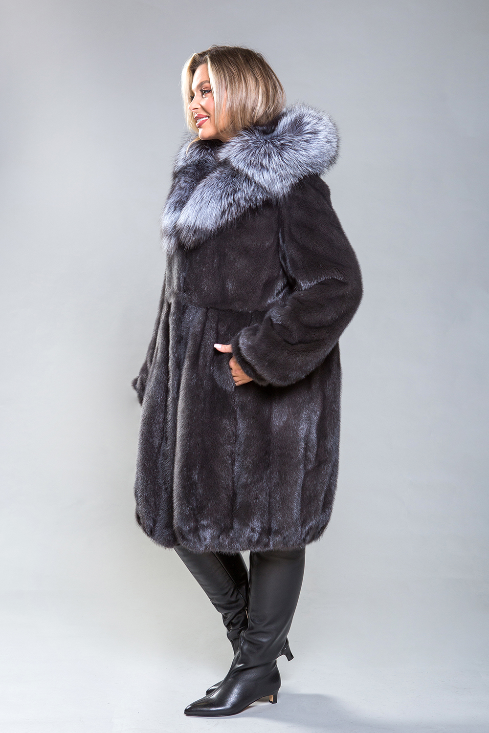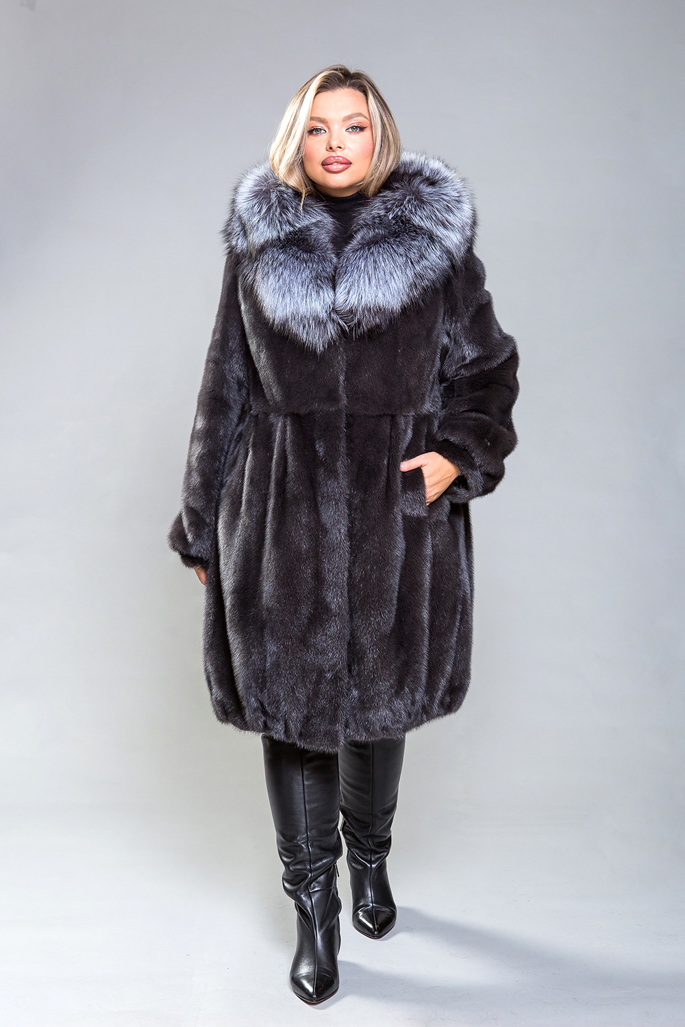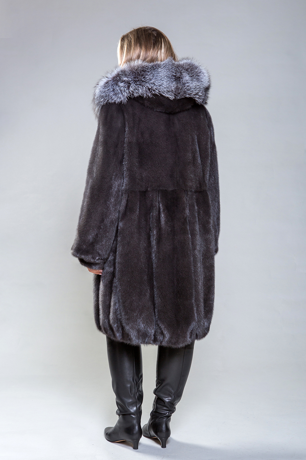 Полупальто из норки украшено капюшоном с изысканной отделкой из чернобурки. Модель выполнена в технике роспуска с пластинами и слегка собранным низом. Длина изделия — 100 сантиметров. Элегантный дизайн и роскошный капюшон формируют выразительный силуэт, делая полупальто утончённым. Шубка идеально садится на любую фигуру благодаря продуманному фасону: слегка завышенная талия и сужение к низу.