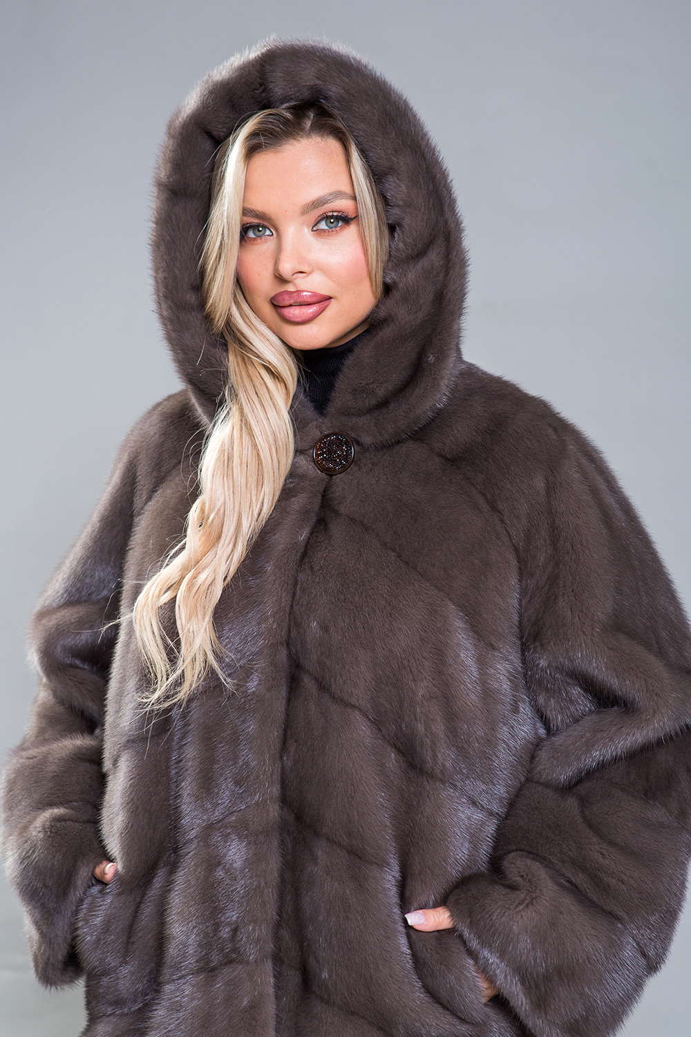 Норковая куртка с капюшоном. Модель выполнена в технике диагональной выкладки пластин. Изделие регулируется утяжками на талии, рукавах и внизу. Длина куртки — 70 см. Она отлично сочетается с брюками любого кроя и юбками любой длины. Эта куртка универсальна, комфортна и уютна.