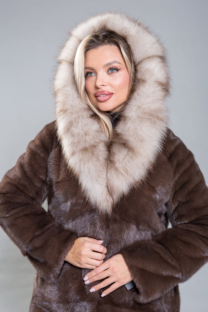 Норковое полупальто — это не только элегантная и стильная вещь, но и символ роскоши и качества. Дополнительный мех куницы на капюшоне придает ему уникальность, создавая неповторимый стиль и эффектный внешний вид. Норковое полупальто с дополнительным мехом куницы, арт.6181 предлагает компания «Фабрика Меха» из Новосибирска. Оно представлено проверенным российским производителем, выполнено в цвете шоколад, отшито методом диагональной выкладки пластин и имеет универсальную длину 100 см. Среди преимуществ этой модели выделяем: