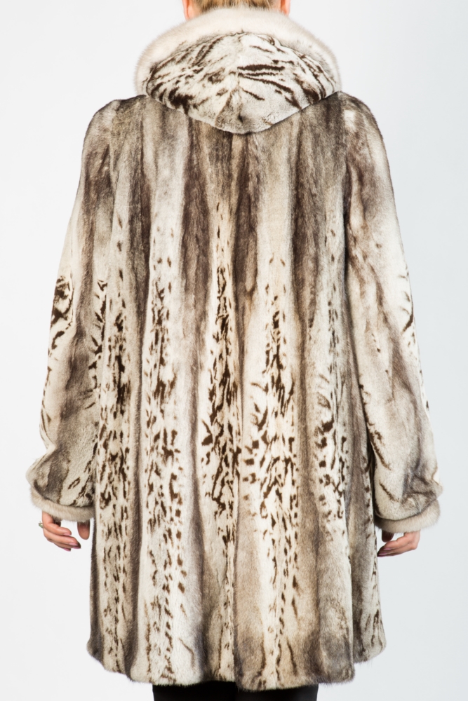 Полупальто женское из меха стриженной норки. Модель классическая расклешенная с капюшоном. Крой изделия роспуск. Рукава прямые. На изделие нанесен трафаретный рисунок. Нет в наличии.