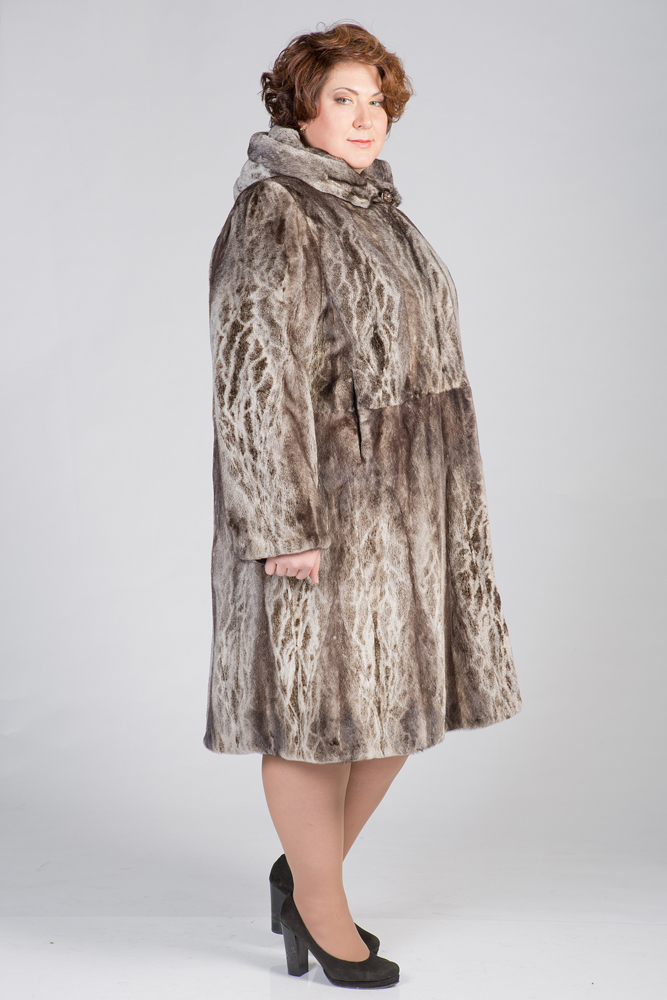 Женское полупальто из меха стриженной норки с капюшоном. Классический прямой силуэт. Крой роспуск с добавлением пластин. На изделие нанесен декоративный трафаретный рисунок. Нет в наличии.