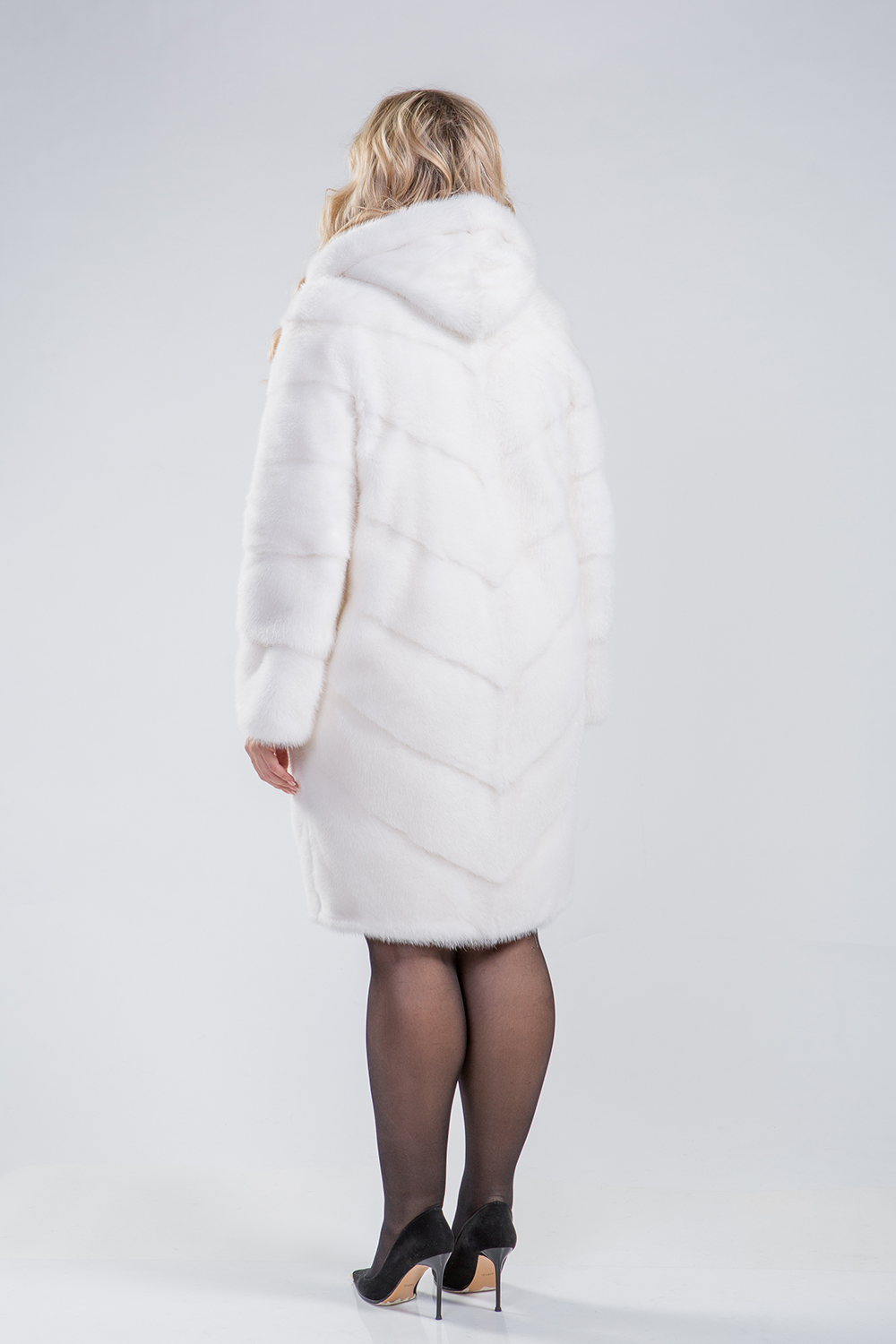 Полупальто из меха норки с капюшоном, созданное с использованием уникальной технологии диагональной выкладки пластин. Рукава модели выполнены в поперечном направлении, что придает изделию особую элегантность. Длина полупальто составляет 100 см.