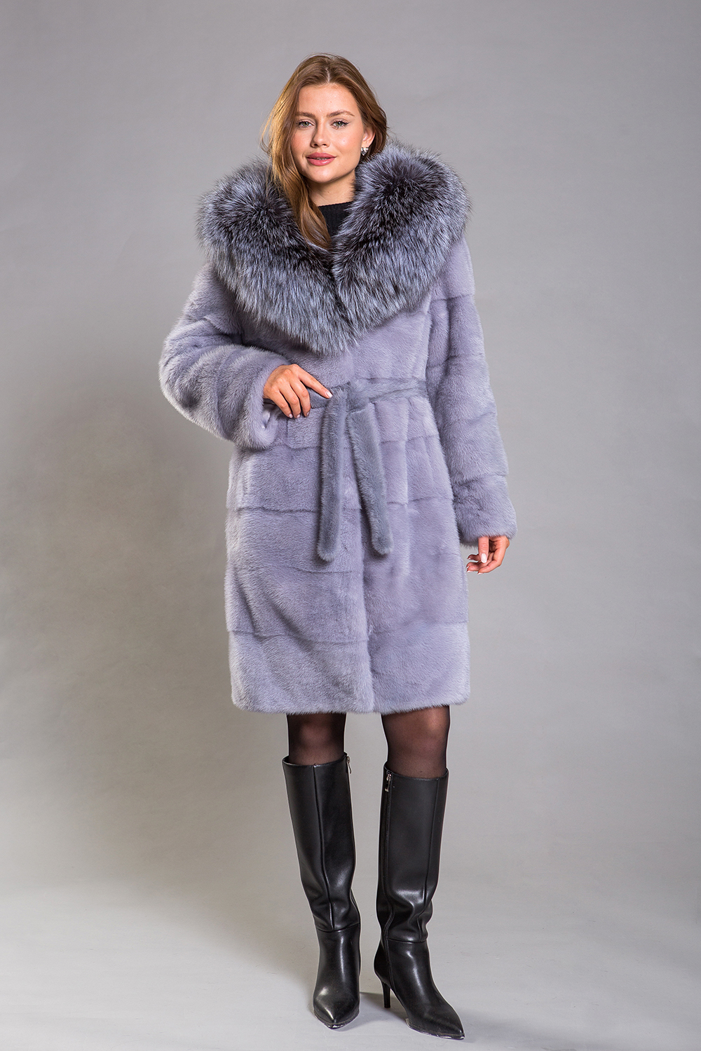 Полупальто из меха норки с капюшоном, украшенным роскошным мехом лисы. Модель выполнена из поперечно выложенных пластин, что обеспечивает её изящество и элегантность. Особенностью этого полупальто являются регулирующие утяжки на рукавах, талии и по низу изделия, что позволяет идеально подобрать размер. Длина шубки составляет 100 см, а рукава можно сделать более укороченными, что делает её ещё более удобной в носке. В комплекте к шубке идёт меховой пояс из меха норки, который придаёт образу изысканность и неповторимость. Нежно-голубой цвет изделия делает его особенно свежим и моложавым, а уютный капюшон обеспечивает комфорт и изящество. Будьте неотразимы в новом норковом пальто!