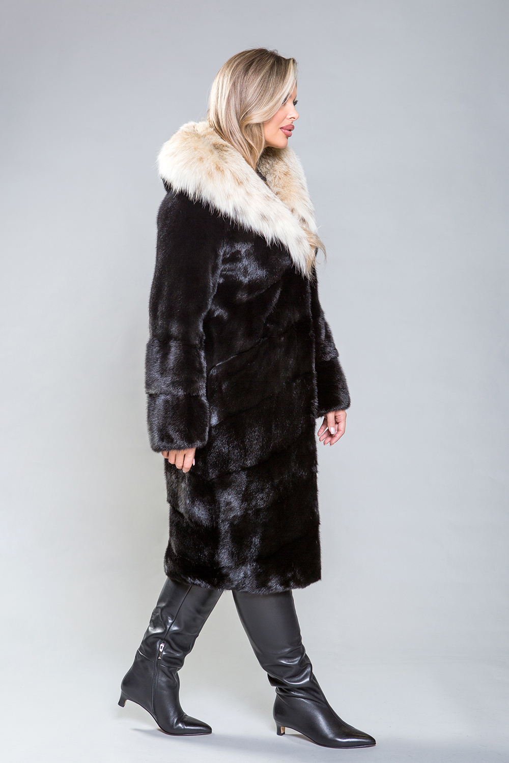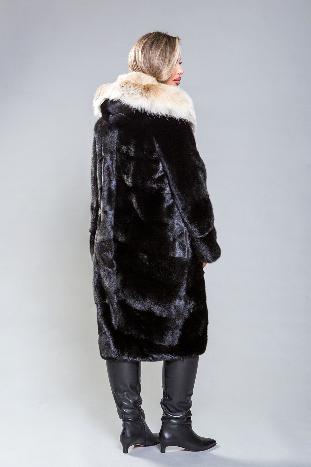 Полупальто из норки с капюшоном из рыси выполнено в технике диагональной выкладки пластин, что придает ему изысканность. Для удобства предусмотрены регулируемые утяжки на талии, рукавах и по низу изделия. Длина изделия 110 см, рукава модели можно укоротить при помощи скрытых молний. Карманы фиксируются на магнитах.