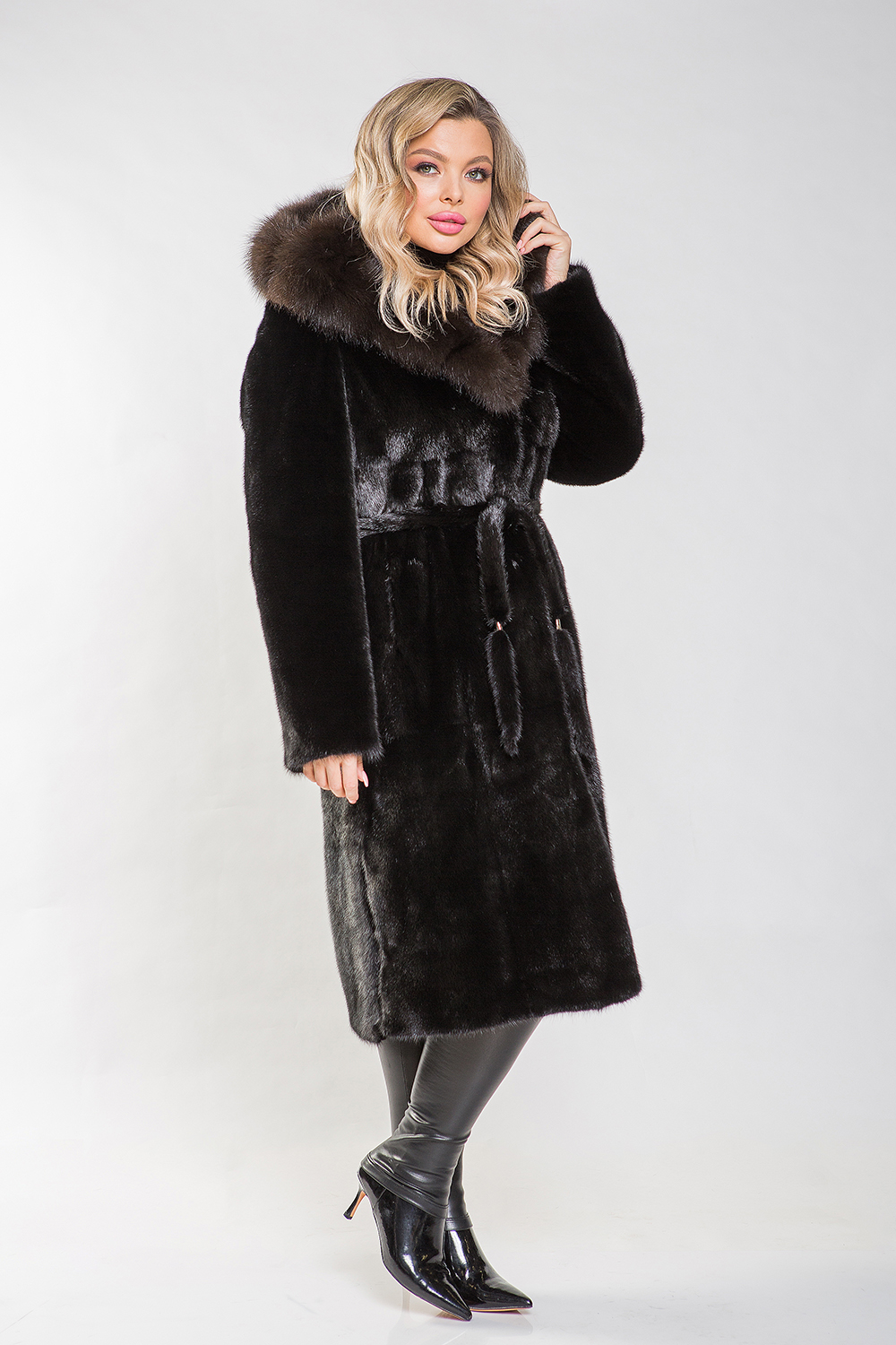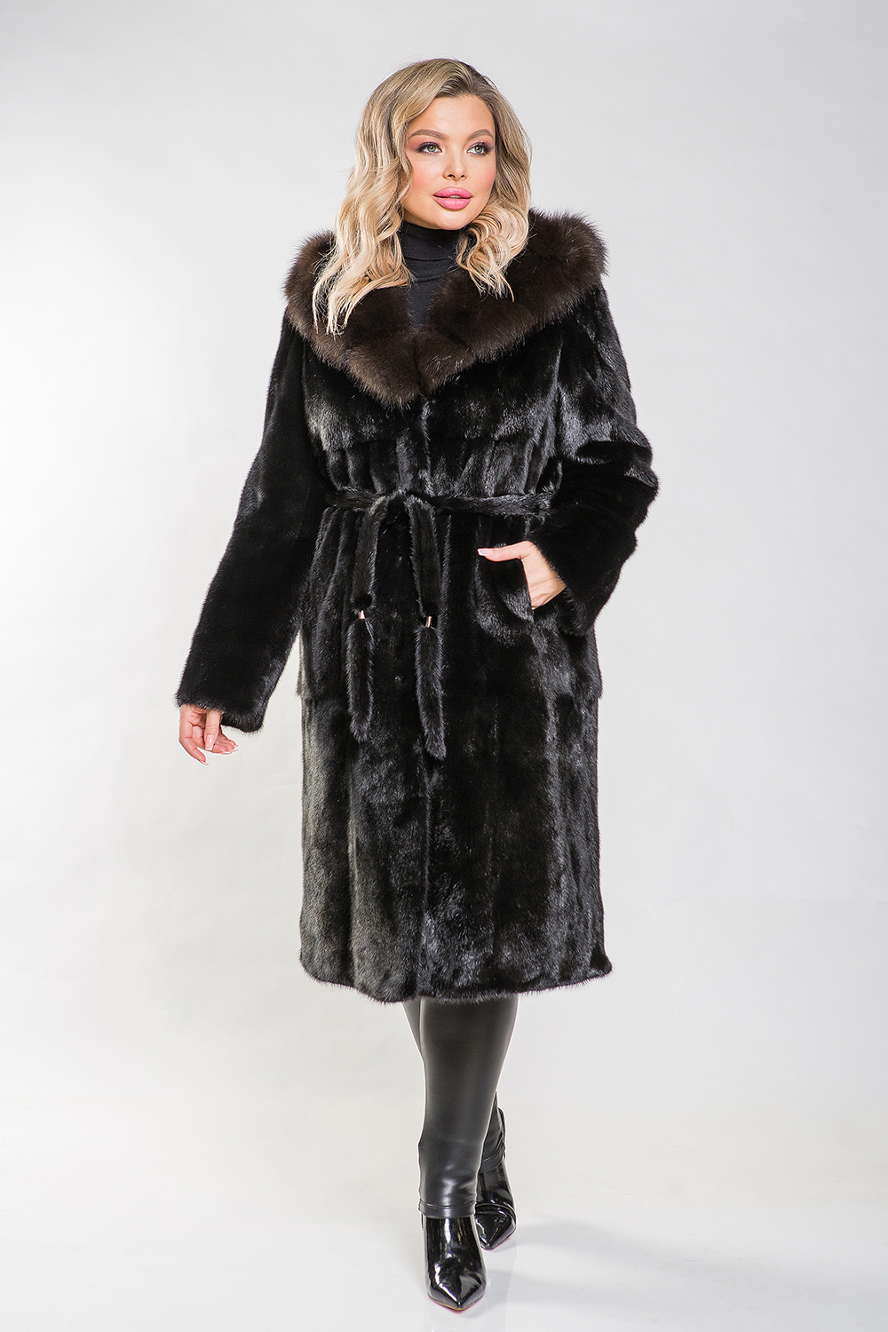 Полупальто, изготовленное из норки, с капюшоном, украшенным мехом куницы, который мастерски имитирует благородный оттенок соболя. Эта модель, выполненная из пластин с роспуском, отличается гибкостью и удобством. Рукава полупальто оснащены регулирующими утяжками, что позволяет подогнать изделие под ваш индивидуальный стиль.
