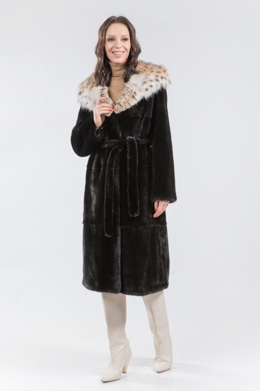 Длина полупальто составляет 110 сантиметров. Меховой пояс подчеркивает стройность и элегантность силуэта, делая образ более утонченным. Эта шубка прекрасно впишется в строгий классический стиль, а её изюминкой являются разрезы по бокам, которые добавляют особый шарм.