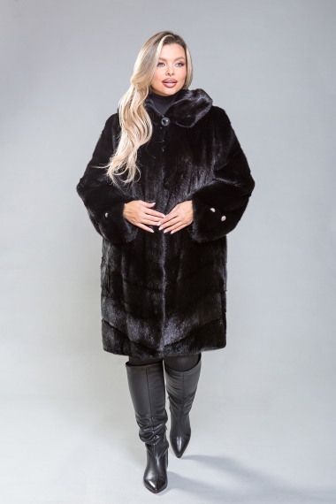 Полупальто из норкового меха с капюшоном. Модель выполнена в комбинированном крое: верх — в технике роспуска, низ — из диагонально расположенных пластин. Спинка сшита из пластин с добавлением элементов роспуска. Полупальто оснащено регулируемыми утяжками, которые можно настроить на талии, рукавах и подоле. Рукава можно укоротить с помощью скрытых молний. Длина изделия составляет 100 см. Это оригинальная и в то же время классическая шубка, которая понравится женщинам разных возрастов и типов фигуры!