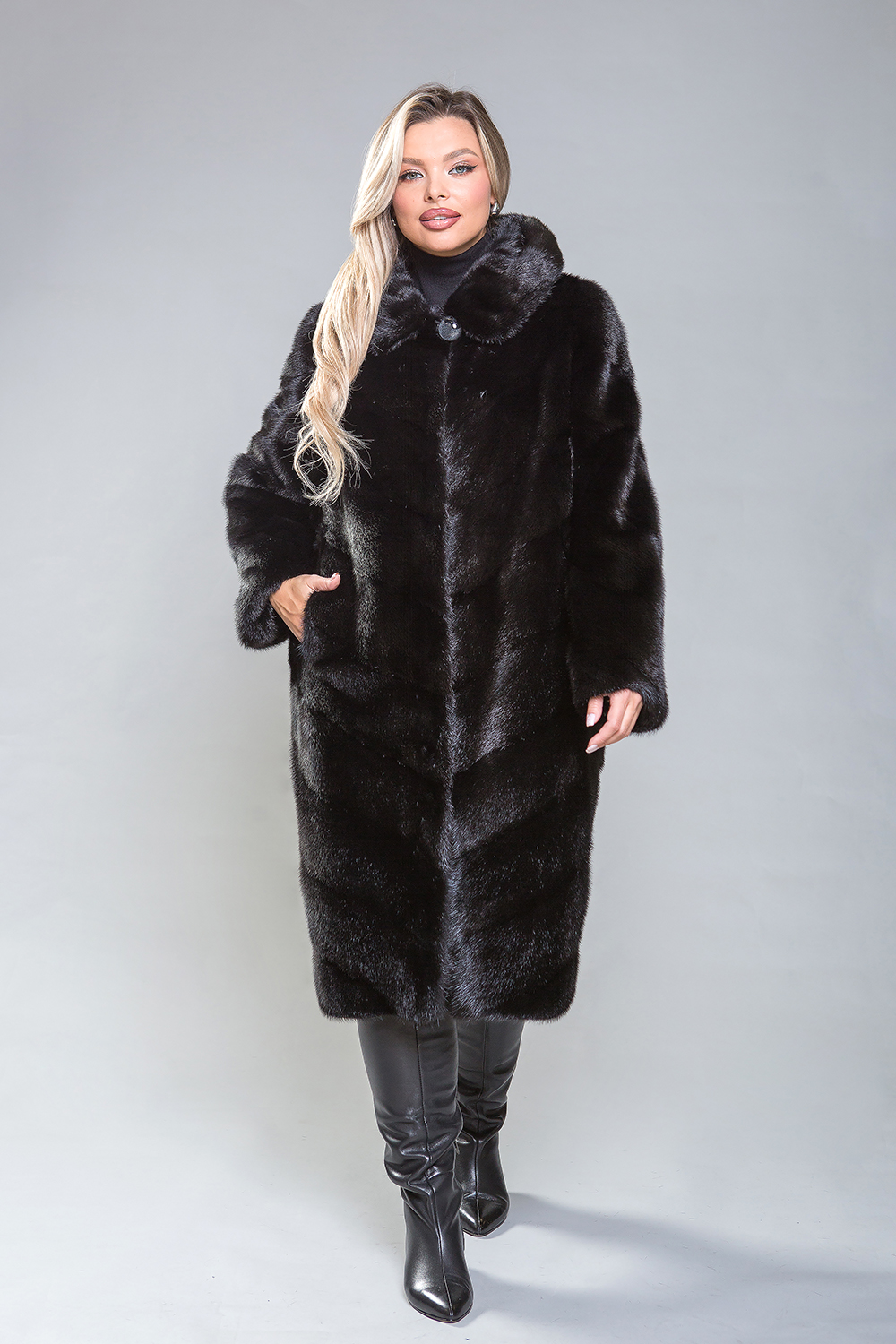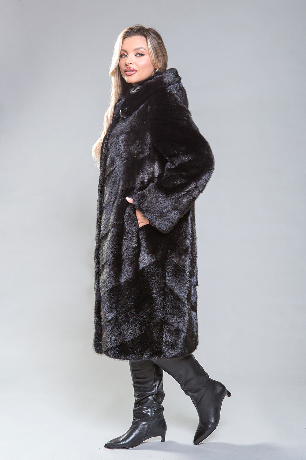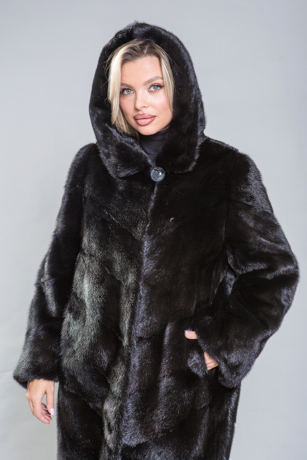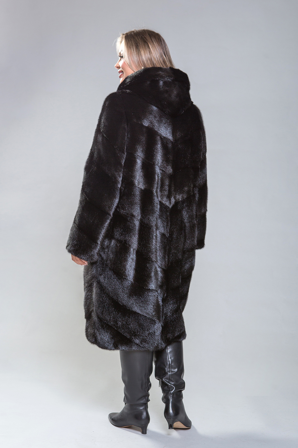 Полупальто из норки с капюшоном, выполненное в стиле диагональных пластин. Модель оснащена регулируемыми утяжками на талии, рукавах и по низу, что позволяет добиться идеального силуэта. Длина изделия составляет 110 см. Это норковое пальто обладает удобным кроем, обеспечивающим максимальный комфорт при носке. Благородный черный цвет добавляет образу изысканности и гармонии.