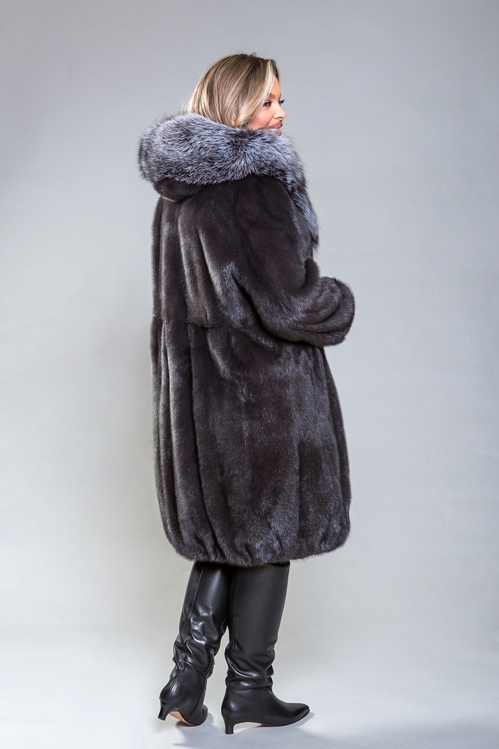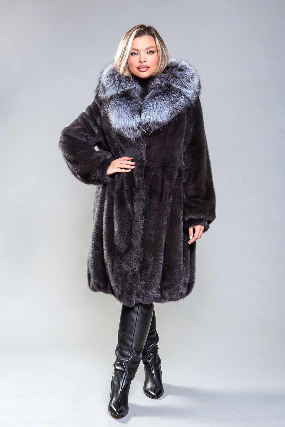 Полупальто из норки украшено капюшоном с изысканной отделкой из чернобурки. Модель выполнена в технике роспуска с пластинами и слегка собранным низом. Длина изделия — 100 сантиметров. Элегантный дизайн и роскошный капюшон формируют выразительный силуэт, делая полупальто утончённым. Шубка идеально садится на любую фигуру благодаря продуманному фасону: слегка завышенная талия и сужение к низу.