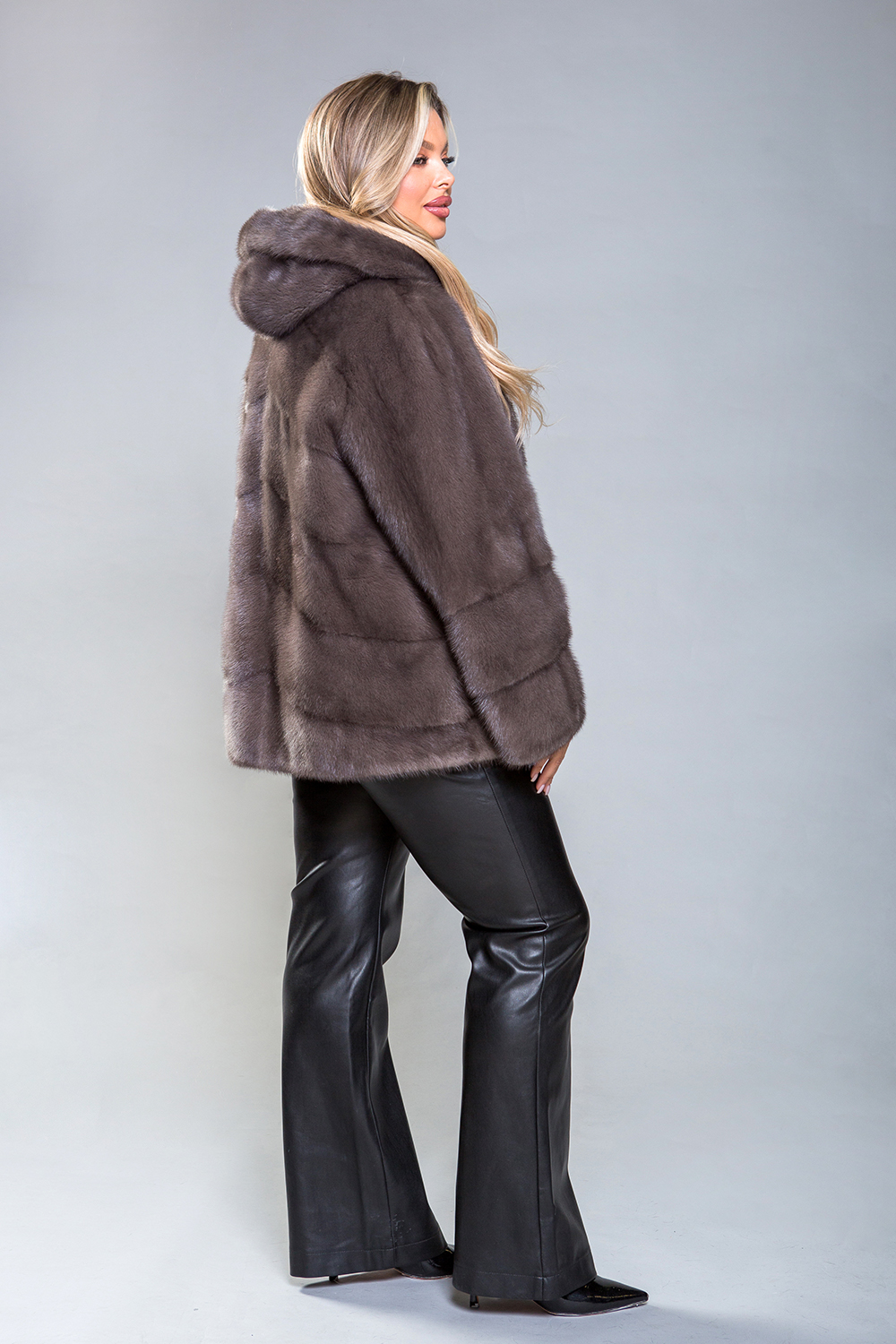 Норковая куртка с капюшоном. Модель выполнена в технике диагональной выкладки пластин. Изделие регулируется утяжками на талии, рукавах и внизу. Длина куртки — 70 см. Она отлично сочетается с брюками любого кроя и юбками любой длины. Эта куртка универсальна, комфортна и уютна.