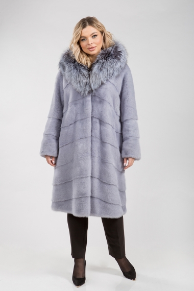 Полупальто из норки с капюшоном, украшенным мехом лисы. Модель имеет комбинированный крой: перед выполнен из пластин, уложенных по диагонали, а спинка — из поперечно расположенных. Для удобства предусмотрены регулирующие утяжки на рукавах и талии. Низ изделия слегка закруглен. Длина шубы составляет 110 сантиметров.