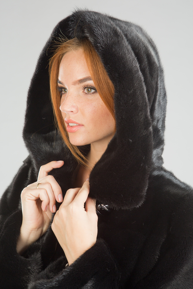 Полупальто из норки с капюшоном, выполненное в технике поперечной выкладки пластин. Длина изделия составляет 100 см. Рукава и низ шубы можно отстегнуть, что позволяет превратить её в миниатюрную и изящную курточку.