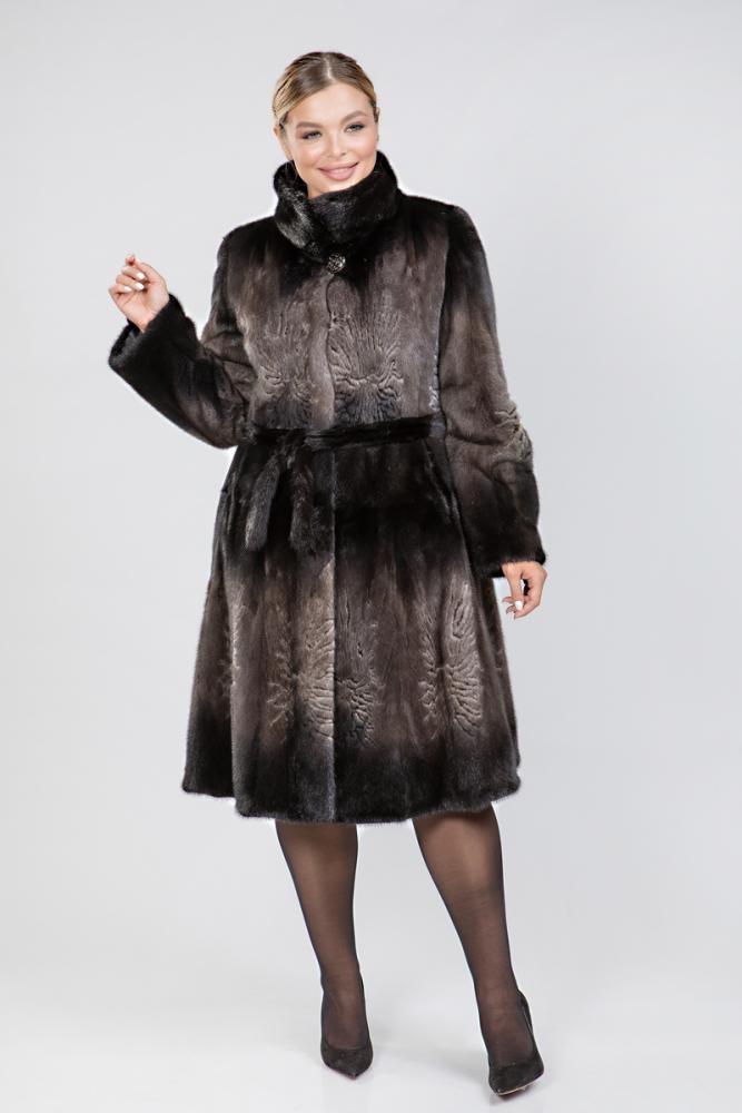 Полупальто из меха стриженной норки с капюшоном. Крой роспуск. Модель декорирована лазерной выстрижкой. Юбка изделия к низу имеет большой клеш, поэтому модель смотрится шикарно! Длина модели 120 см. Такое меховое пальто подкупает своей оригинальностью и очарованием!