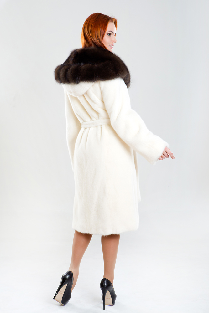 Полупальто из меха норки. Капюшон декорирован мехом соболя. Модель классическая прямая, по бокам разрезы. Крой изделия пластины с добавлением роспуска. По-королевски роскошная и эксклюзивная шубка! В таком белоснежном произведении вы всегда неотразимы!