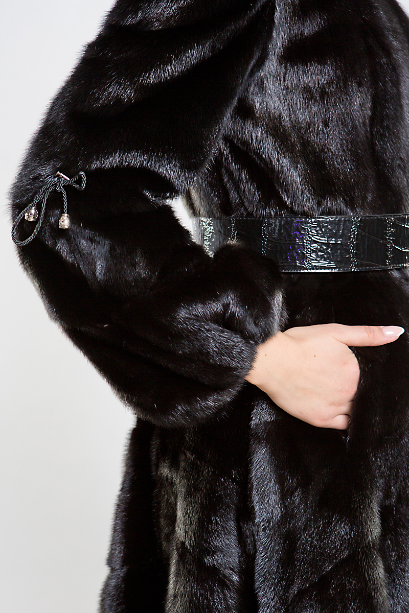 Полупальто из меха норки с капюшоном. Верх изделия сшит в роспуск, а юбка модели - диагональная выкладка пластин. На талии и рукавах шубки регулирующие утяжки. Длина изделия 100 см. Оригинальная молодежная шубка, в которой тепло, красиво и комфортно!