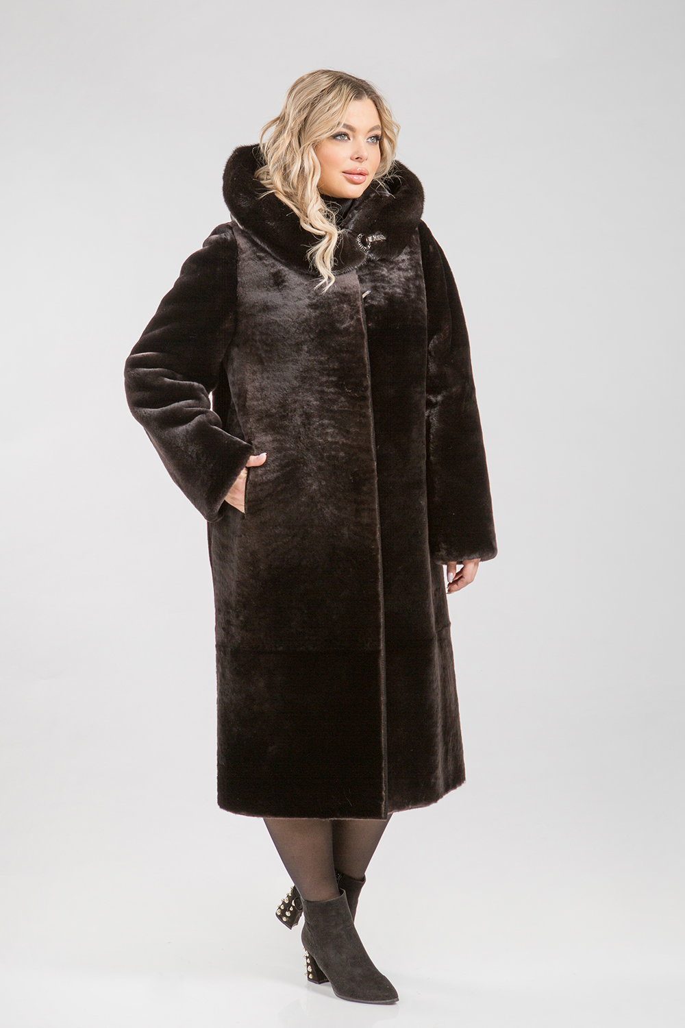Полупальто из овчины, декорированное капюшоном из меха норки. Рукава можно подвернуть, создав манжет, или укоротить, если это необходимо. Карманы и борта модели отделаны натуральной кожей. Длина изделия составляет 115 сантиметров.