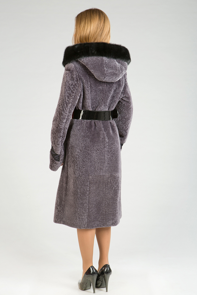 Полупальто из меха овчины (астрагана). Капюшон модели дополнен мехом норки. Борта изделия выполнены из натуральной кожи. Модель декорирована мехом пони и застегивается на пуговицы. Длина изделия 105 см. Шубка благородного цвета муссона обладает эстетическими достоинствами и идеально соответствует климатическим условиям нашего региона!